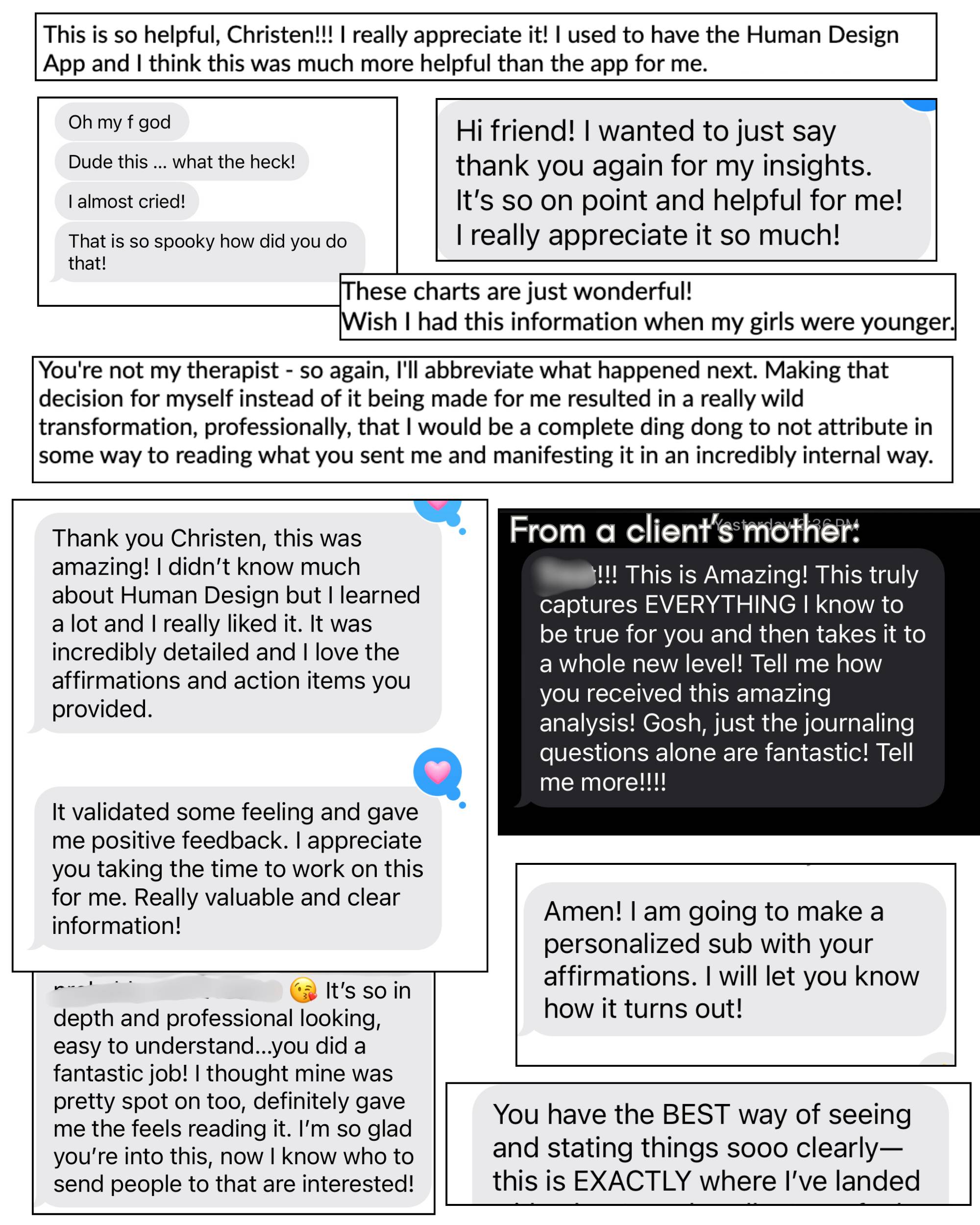 I’m Christen, a certified Human Design Coach with a background in mindset work, leadership, and deep self-healing. I've been where you are — searching for direction in a noisy world. My clients often tell me these reports bring clarity, peace, and confidence to their everyday lives.